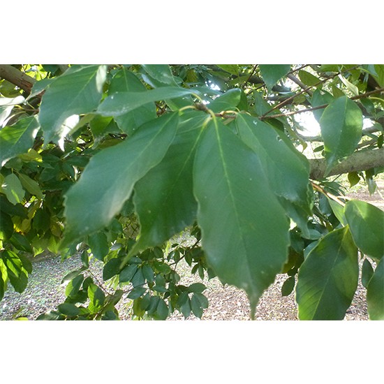 Quercus glauca is an evergreen tree, oval then rounded-shaped. Leaves are elliptic, serrated near the apice, glossy dark green above and grey-green beneath. Young leaves are bronzed.