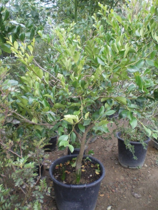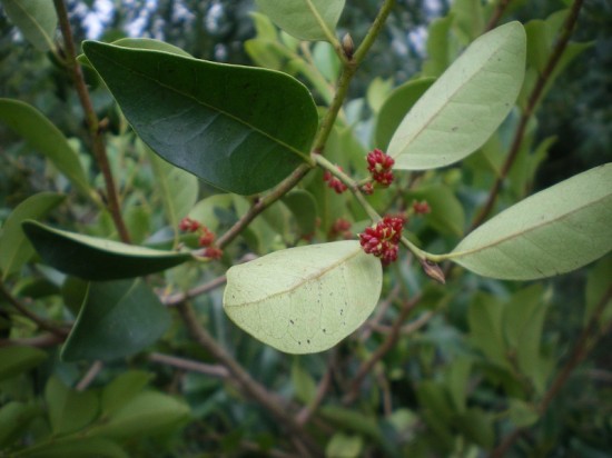 Distylium myricoides è un cespuglio di origine cinese, molto raro, con foglie scure blu-grigio e un fiore, simile a quello della Parrotia, di colore rosso. Crescita lenta.