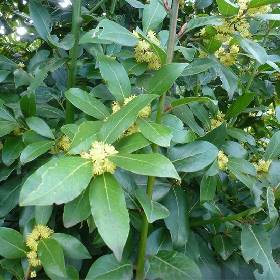 Laurus nobilis is a large, erect evergreen shrub with aromatic, narrowly ovate, leathery leaves useful in cooking. Flowers small, pale greenish-yellow, in dense clusters; fruit oval, glossy black when ripe.