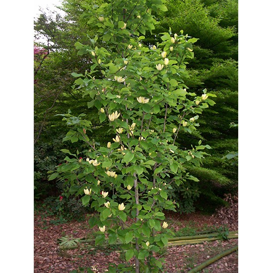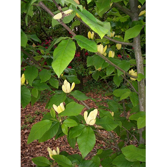 Magnolia ‘Yellow Bird’ è un ibrido M. acuminata x M. brooklynensis ‘Evamaria’. E’ un albero deciduo dal portamento eretto e piramidale, con foglie verde medio lunghe fino a 25 cm. A fine primavera si riempie di bellissimi fiori a coppa di color giallo larghi fino a 12 cm.