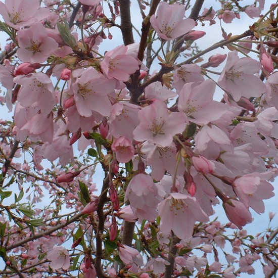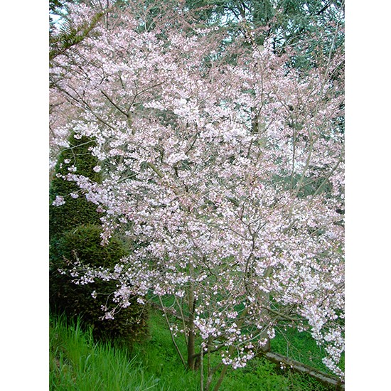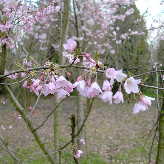 Prunus ‘Pink Shell’ is a small, spreading, deciduous tree, to 8m tall, the light green young leaves contrasting with the delicate, single, pale pink, hanging, cup-shaped blooms 2cm wide.