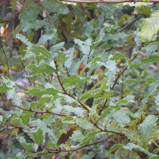 Quercus trojana è un albero deciduo che può raggiungere i 15 m di altezza, ma spesso ha un portamento quasi arbustivo. La chioma è globosa-espansa in orizzontale, con tronco diritto e ramoso fino alla base. La scorza, è solcata e scura. Le foglie sono coriacee, lucide, alterne, a lamina obovata-oblunga, seghettate, sono lunghe fino a 9 cm e verdeggiano tutto l’inverno per cadere, ormai disseccate e color dell’oro bruciato, soltanto nella primavera successiva a quella di formazione.