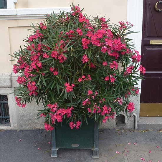 N. oleander is an evergreen shrub with narrowly lance-shaped grey-green leaves and terminal clusters of salver-shaped, pink, white or red flowers 3-4cm across, in summer. It can be up to 2 m tall.