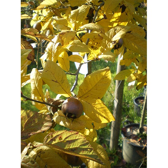 Mespilus germanica è un piccolo albero o grande arbusto dalle foglie sono grandi, ovali, di colore verde scuro sul lato superiore, quasi bianche sul lato inferiore. In tarda primavera produce fiori solitari, all’apice dei rami nuovi, di colore bianco. In autunno produce frutti tondeggianti (5cm), di colore arancione intenso.