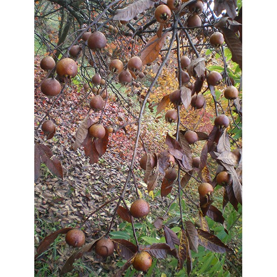 M.germanica is a spreading deciduous small tree or large shrub with oblong leaves turning yellow-brown in autumn, and white flowers 5cm in width in late spring, followed by brown fruit 5cm across.