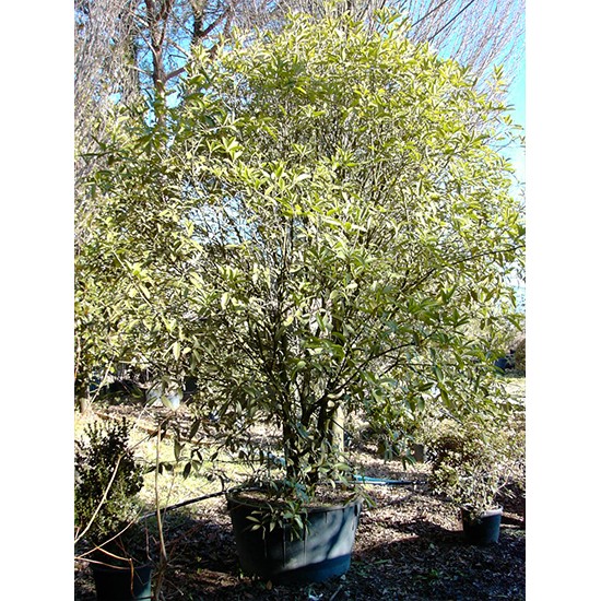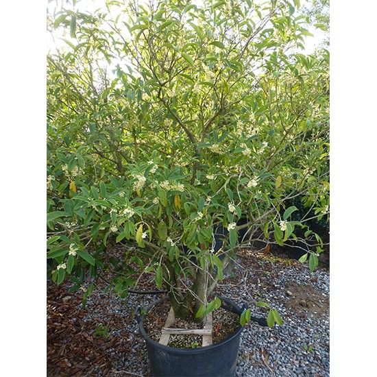 Osmanthus armatus is a dense, rounded-shape shrub, with dark green leaves, glossy, lanceolate, dented, 15cm long. Maximum height 2 m. Fragrant cream-white flowers in autumn, followed by dark purple fruits.