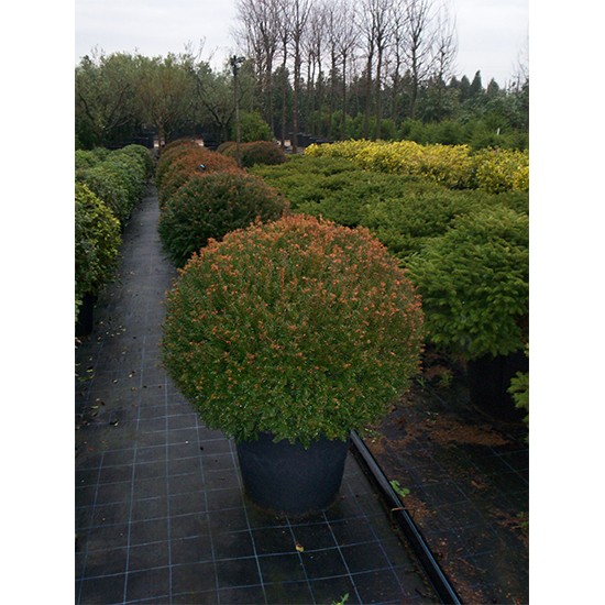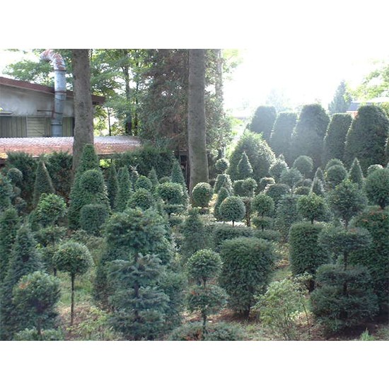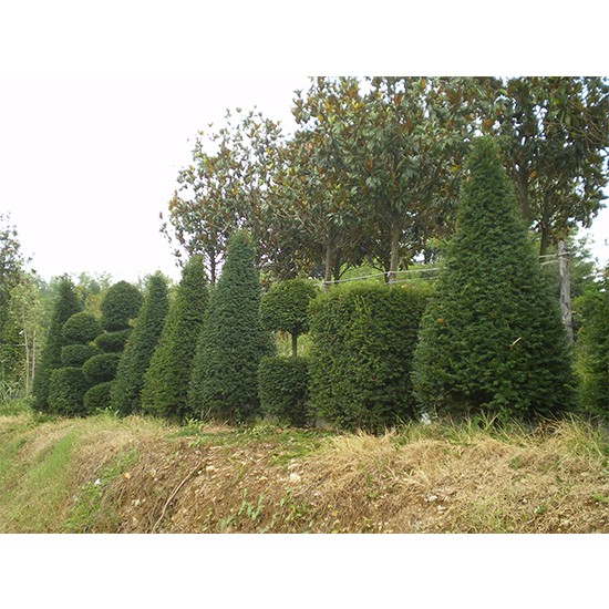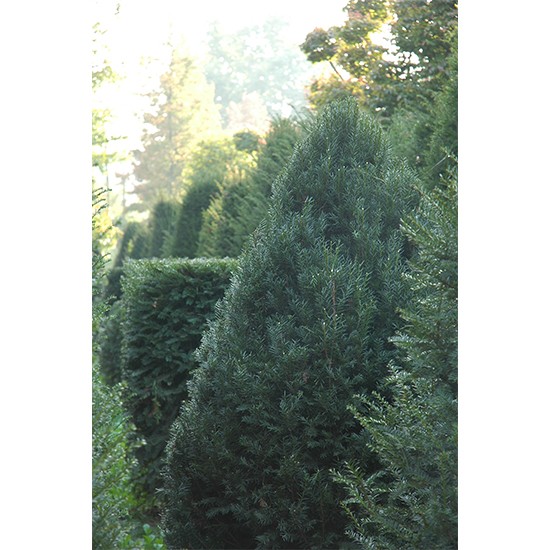T. baccata is a medium-sized bushy evergreen tree with narrow, leathery, very dark green leaves arranged in two rows on the shoots, and insignificant flowers followed on female plants by fleshy red fruits.