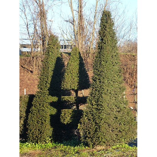Taxus baccata è una conifera dal portamento da largamente conico ad irregolarmente arrotondato allo stadio adulto. I rami sono espansi, orizzontali, con rametti leggermente ricadenti. Le foglie sono lineari verde scuro, e i fiori sono seguiti, negli esemplari femminili, da tenere bacche rosse.